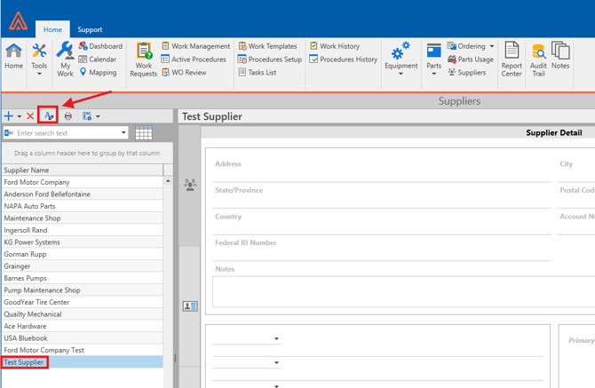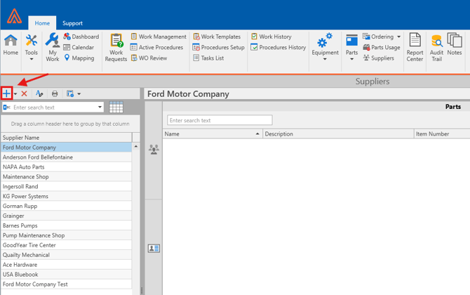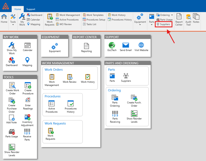 1. In the Parts and Ordering group of the Home ribbon, click the Suppliers button.