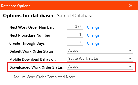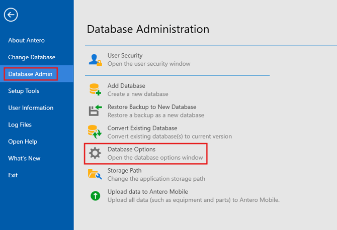 Before you begin, it is recommended that you review and configure the Mobile Download Behavior setting. This option, located under Database Admin > Database Options, determines how completed Work Orders are handled when they are downloaded from Antero Mobile. The steps below will guide you through updating this setting to ensure Work Orders are routed as expected.