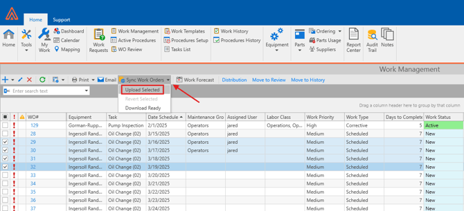 After you made your selection you want to click on Sync Work Orders and select the Upload Selected Option from the drop down.