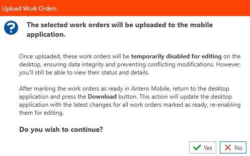 Select No if you still need to make Modifications to the Work Order prior to sending it to the cloud.