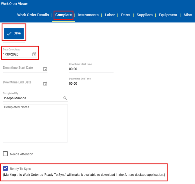 When you are ready to Complete a work order make sure you Select a Date Completed, click the Ready To Sync Tick Box, and click Save.