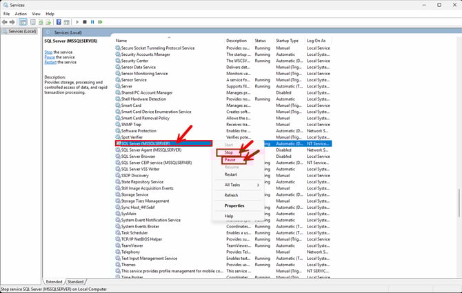 You can do this by opening Services on your Windows system, and right clicking, selecting either Stop or Pause, as shown below.