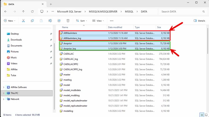 Note: The contents in the "Red Box" are the files for the Antero License Database, and the contents in the "Green Box" are the Antero Database itself. If you have more than one Antero Database, you will need to copy the .log and .mdf for each Antero Database.