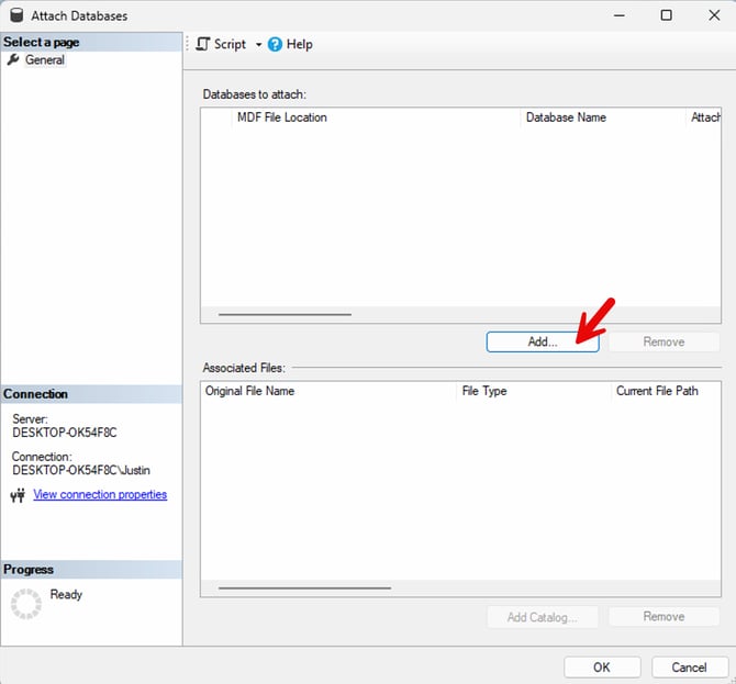 Note: The .mdf and .log files will only show here if you copied them into the correct directory, otherwise you will need to locate and point to them on the computer. I STRONGLY recommended placing the files in the DATA folder, as this may cause issues later if not done properly.