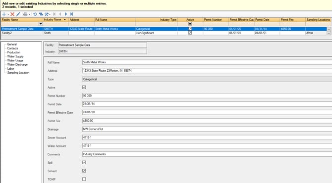 The Industry list in Operator10 Pretreatment allows users to store and track all businesses and industries as it relates to an Industrial Pretreatment Plan. The Industry list provides users areas in which to store information in addition to Industry name, contact information, and assigned sampling location information.