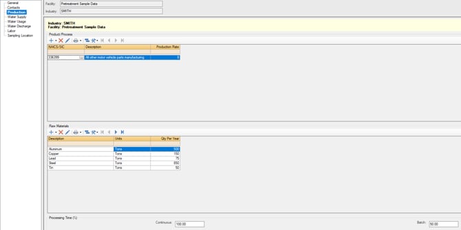 1. When selected, the Production section displays Product/Process information as well as Raw Materials used in the manufacturing process for the selected industry. The details section displays two grids in which Product/Process information and Raw Materials can be entered.