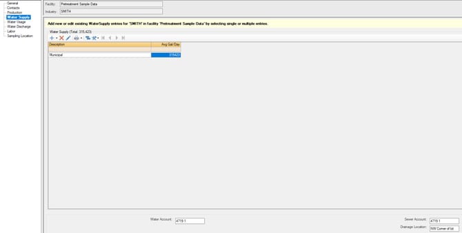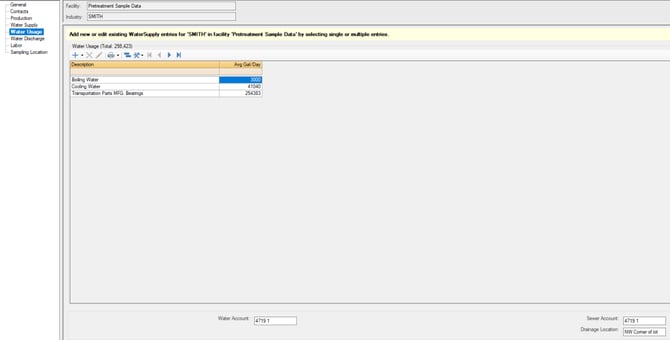 2. Enter or edit Descriptions and Averages for Water Supply, Water Usage, and Water Discharge in the Industry Water Usage Editor.