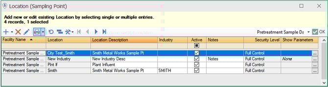 The Sampling Locations list for Operator10 Pretreatment Industries functions in the same manner as the Location list.