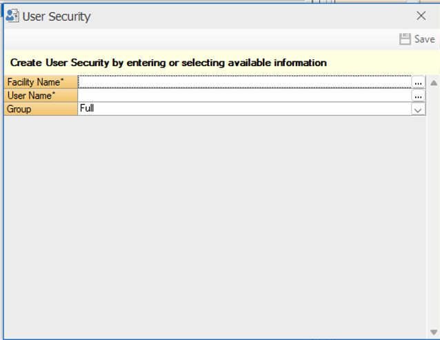 Press the "..." button next to "Facility Name" and "User Name" to select the proper Facility, and User, then press the "Save" Button.