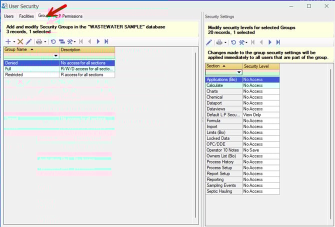 If you wish to make "Groups" instead of defining a users permissions individually you can do that here. These permissions can then be assigned to a user on the "Facilities" tab using the dropdown, as shown below.