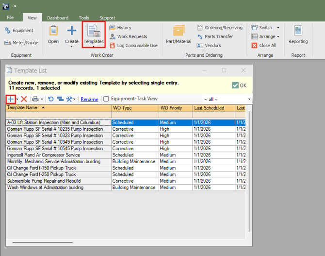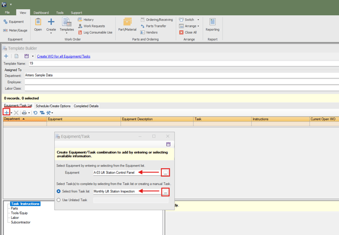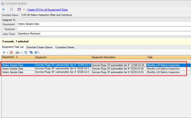 In legacy versions of Antero, the Template Builder allowed users to add multiple pieces of Equipment and multiple Tasks to a single template, and then schedule the entire list using the Schedule/Create options. While this approach made it faster to schedule a large number of tasks, it also increased the risk of losing visibility into where Work Orders were being scheduled from, especially in environments with a large number of templates.