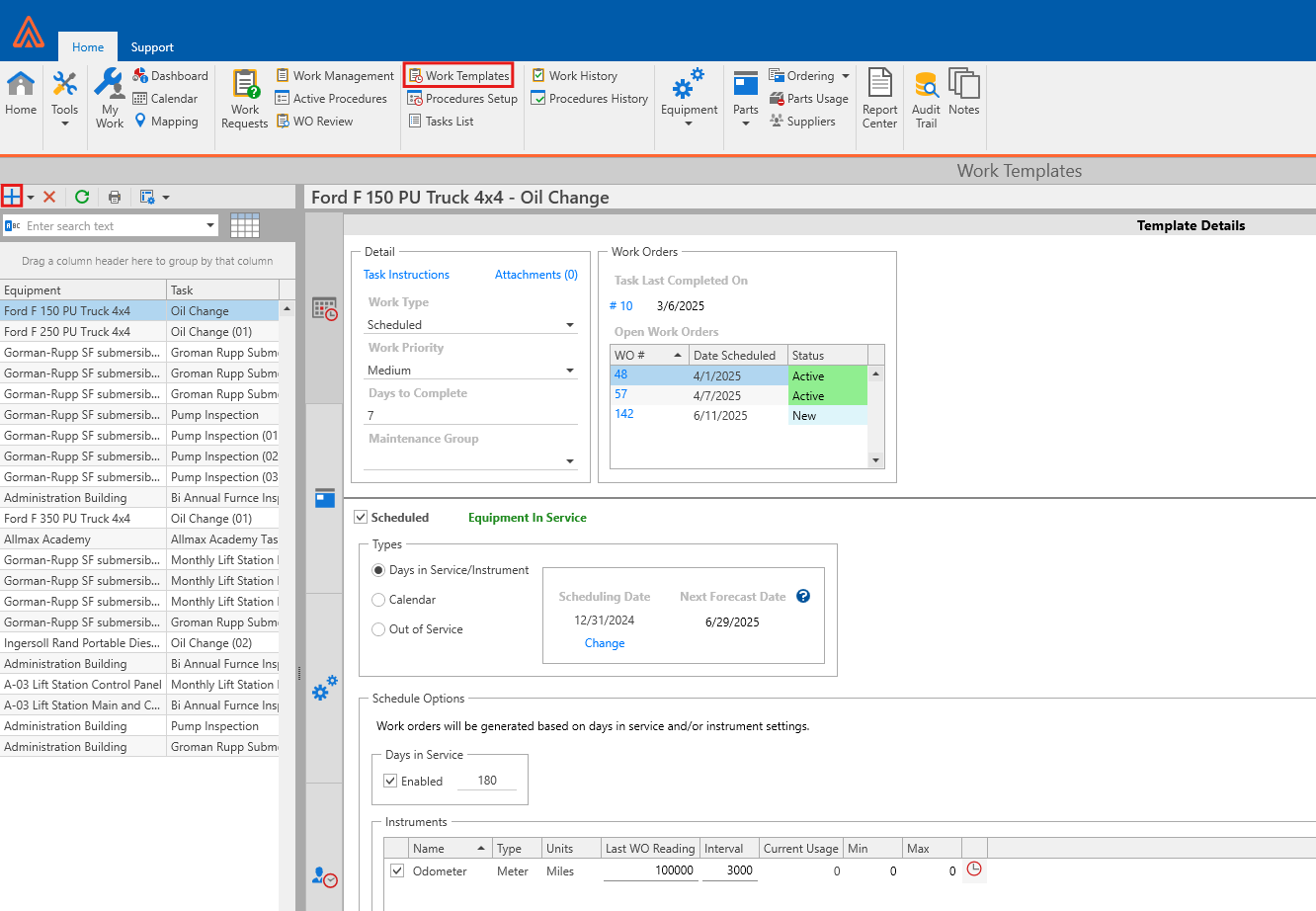 In Antero 7, this approach has been simplified. Templates are now designed to represent a single Work Order, consisting of one piece of Equipment and one Task, which is scheduled independently. While this may require more individual scheduling upfront, it provides greater clarity and control, making it easier to track where Work Orders originate once they are configured.