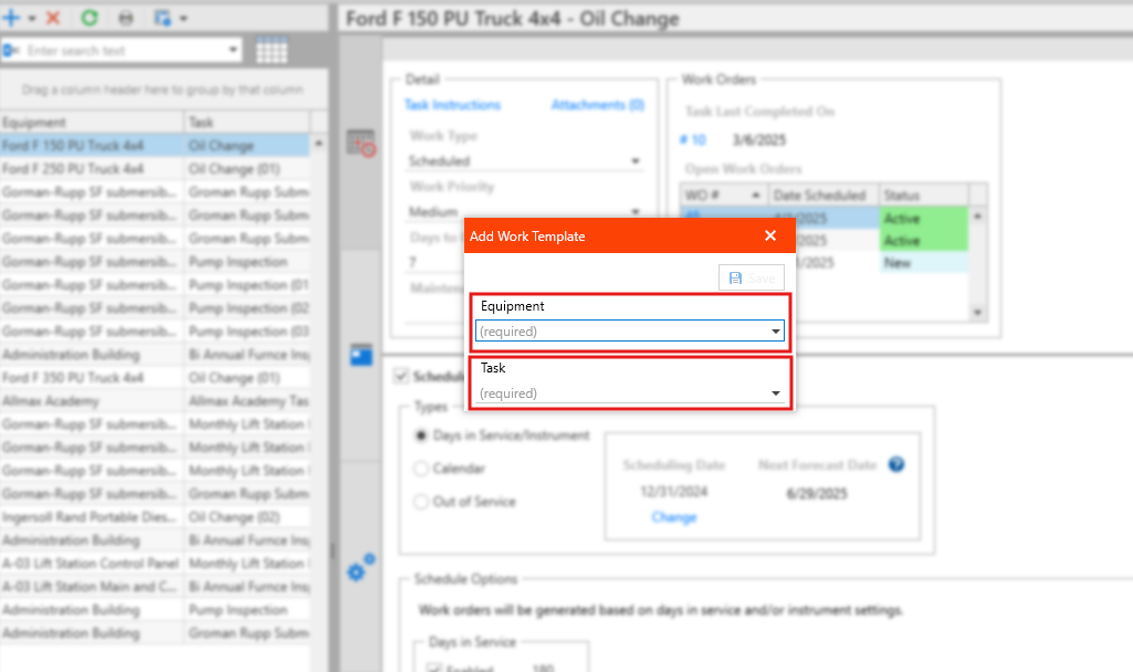 An Add Work Template window will appear. Here you will select a piece of Equipment and Task from a drop down list.
