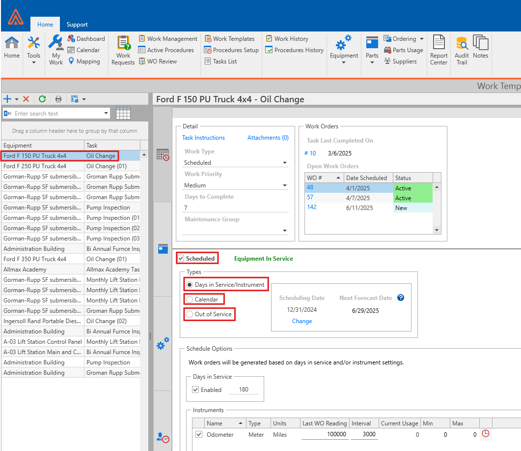 Days in Service / Instrument Scheduling allows you to schedule work orders based on a defined interval in days. This option also supports scheduling based on instrument readings.
